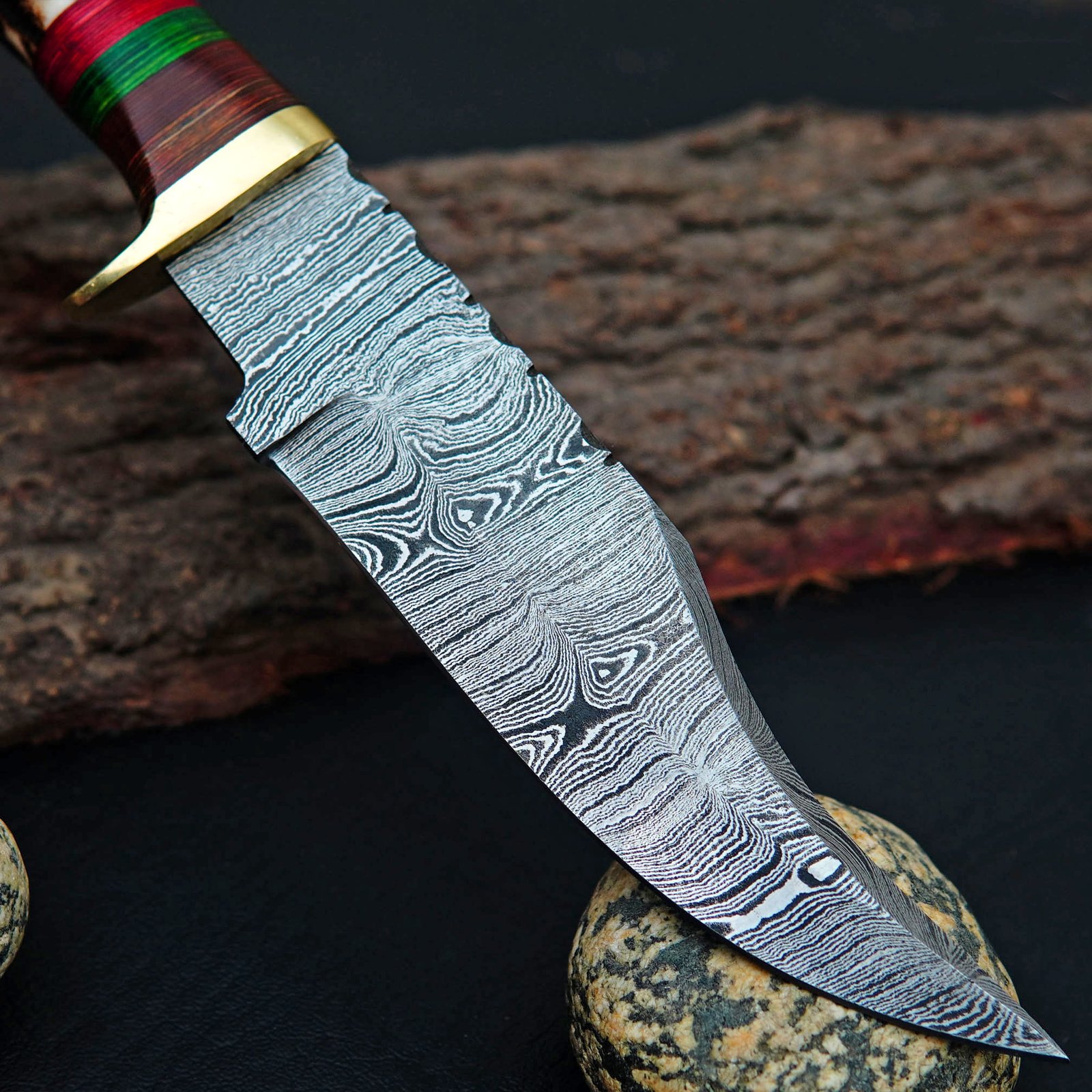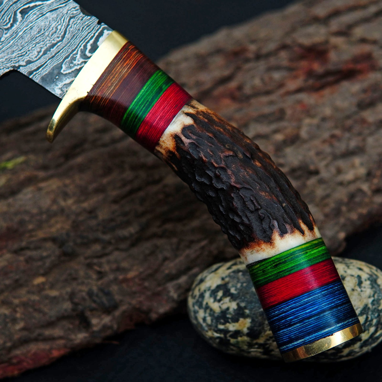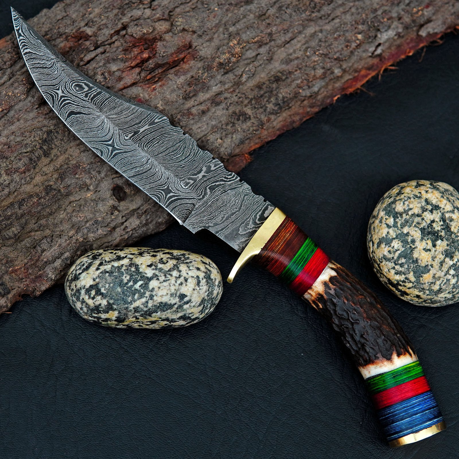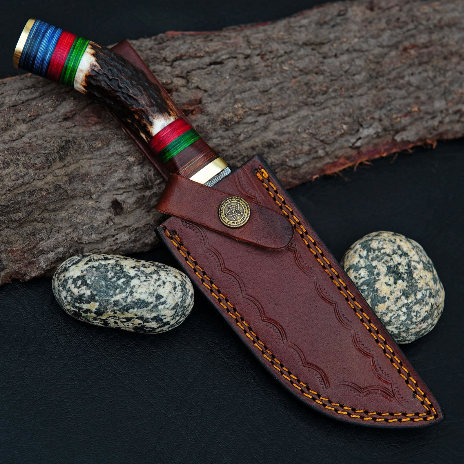 Hand Forged Damascus Hunting Knife: Stag Antler Handle, Leather Sheath