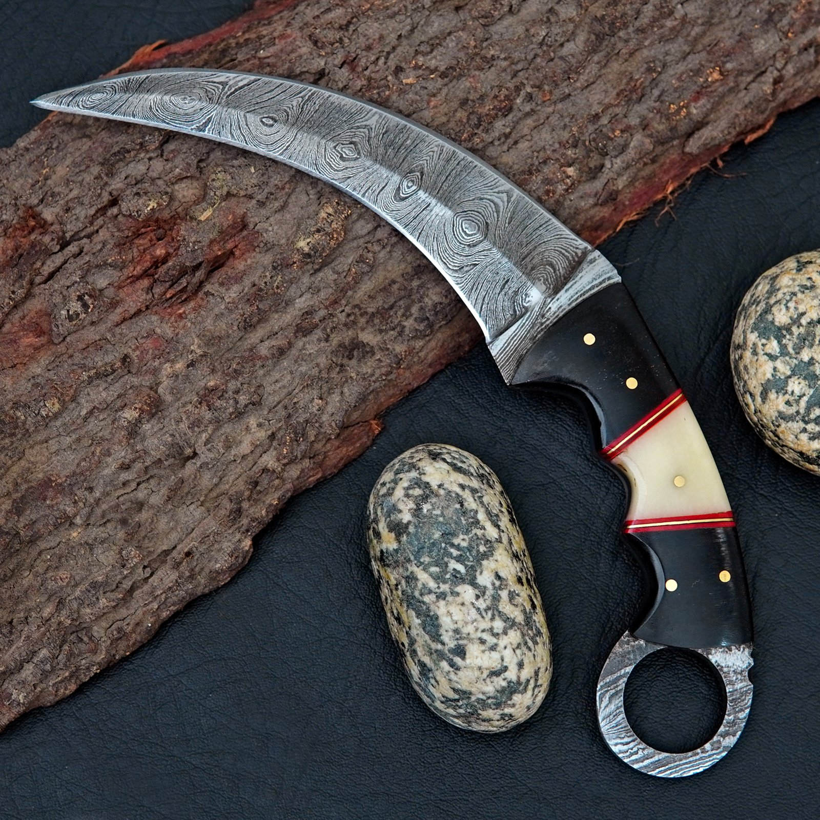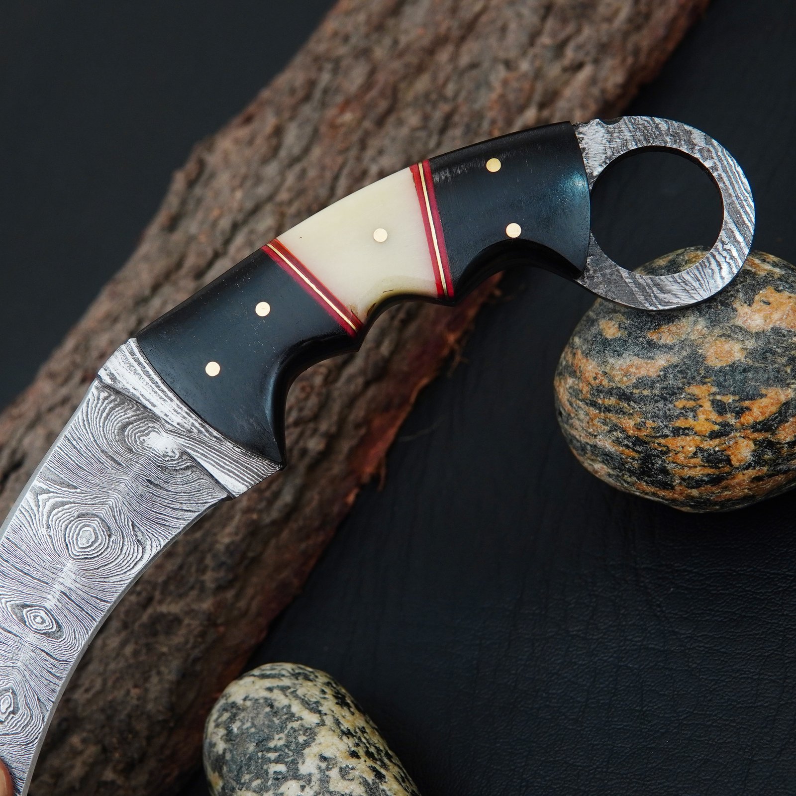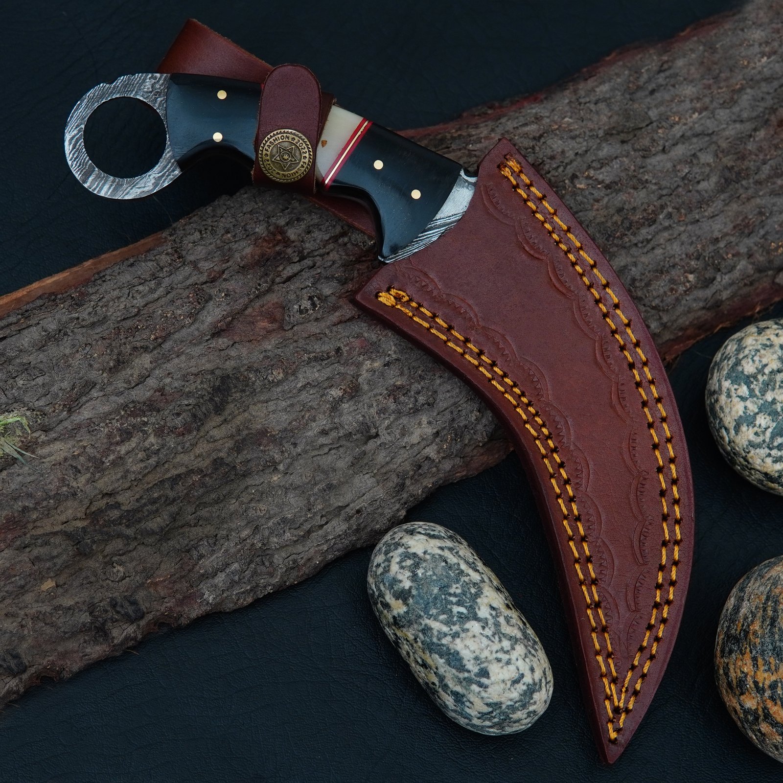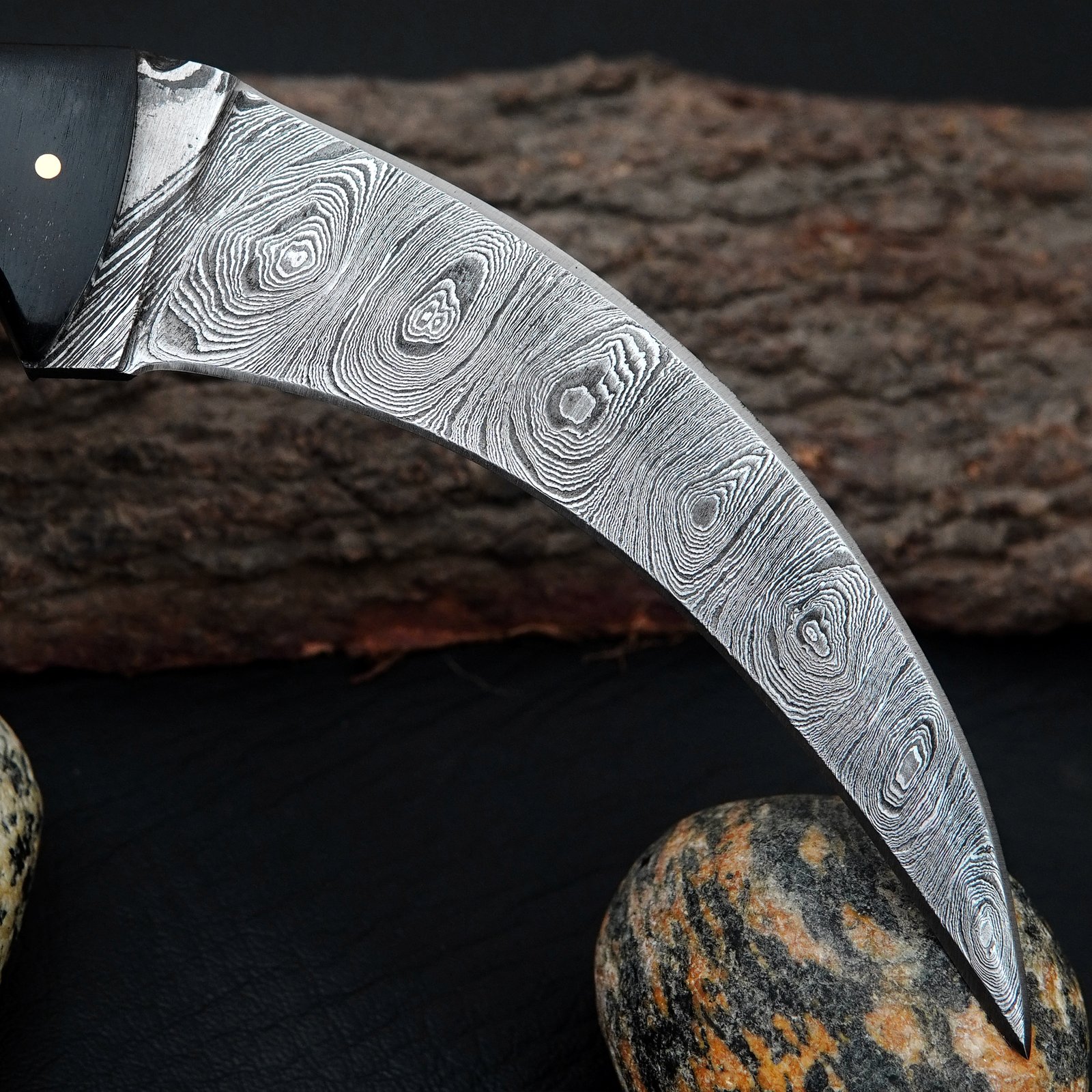 Embrace the Fusion of Tradition and Precision Craftsmanship with our Beautiful Handmade Damascus Karambit Knife. Complete with Leather Sheath.