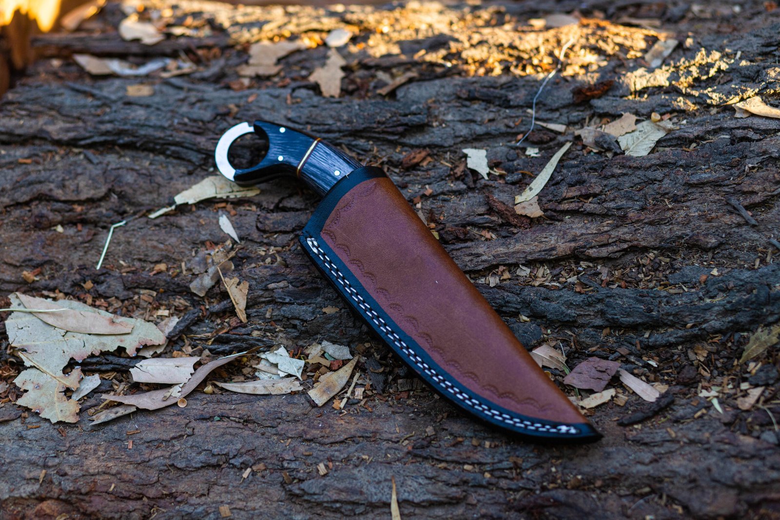 ”All of our knives are 100% handcrafted. True quality material used to form the blade. The handle materials, blade steels, and leather sheaths are made professionally with no expense spared. Great handle fitting, exception edge, nicely balanced grasp.